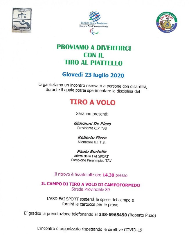 La FAI SPORT insieme all'Associazione Sportiva Tiro a Volo Campoformido e al Comitato regionale del CIP Friuli Venezia Giulia ha organizzato un incontro riservato a persone con disabilità che intendano provare a cimentarsi con il tiro a volo.